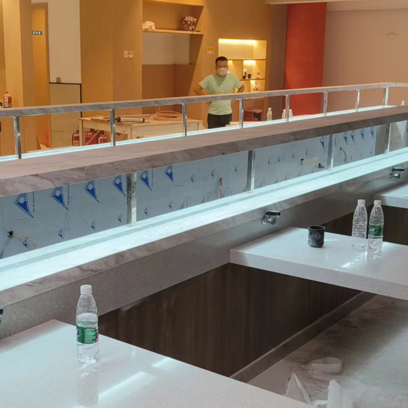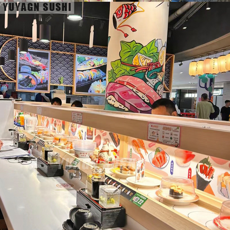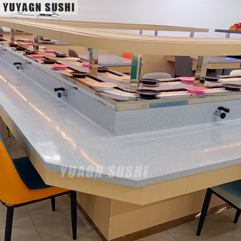 实践表明,每10个座位对应4-5米的传送带长度最为经济。例如深圳某知名连锁品牌通过热成像技术分析发现,超过7米的传送距离会导致寿司温度下降2-3℃,直接影响口感。建议采用模块化分段温控系统,在每3-4米间隔加装独立制冷单元。